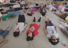 ヨガニドラ(yoga nidra)とは、「眠りの瞑想」ともいわれるリラクゼーション法のひとつです。ヨガのテクニックを使い、インストラクターのガイドに耳を傾けながらリラクゼーションを誘導します。ラフターヨガ(笑いヨガ)の後は、エネルギーが高まり、いわゆる興奮状態になっていますので、リラクゼーションによって心身を元に戻すことが必要です。またこのリラクゼーションによって免疫力がさらにアップすることが分かっています。頭のてっぺんからつま先まで(逆もあります)、指示された体の各部位に意識を向けながら、ゆっくりと呼吸を繰り返しリラックスしていきます。